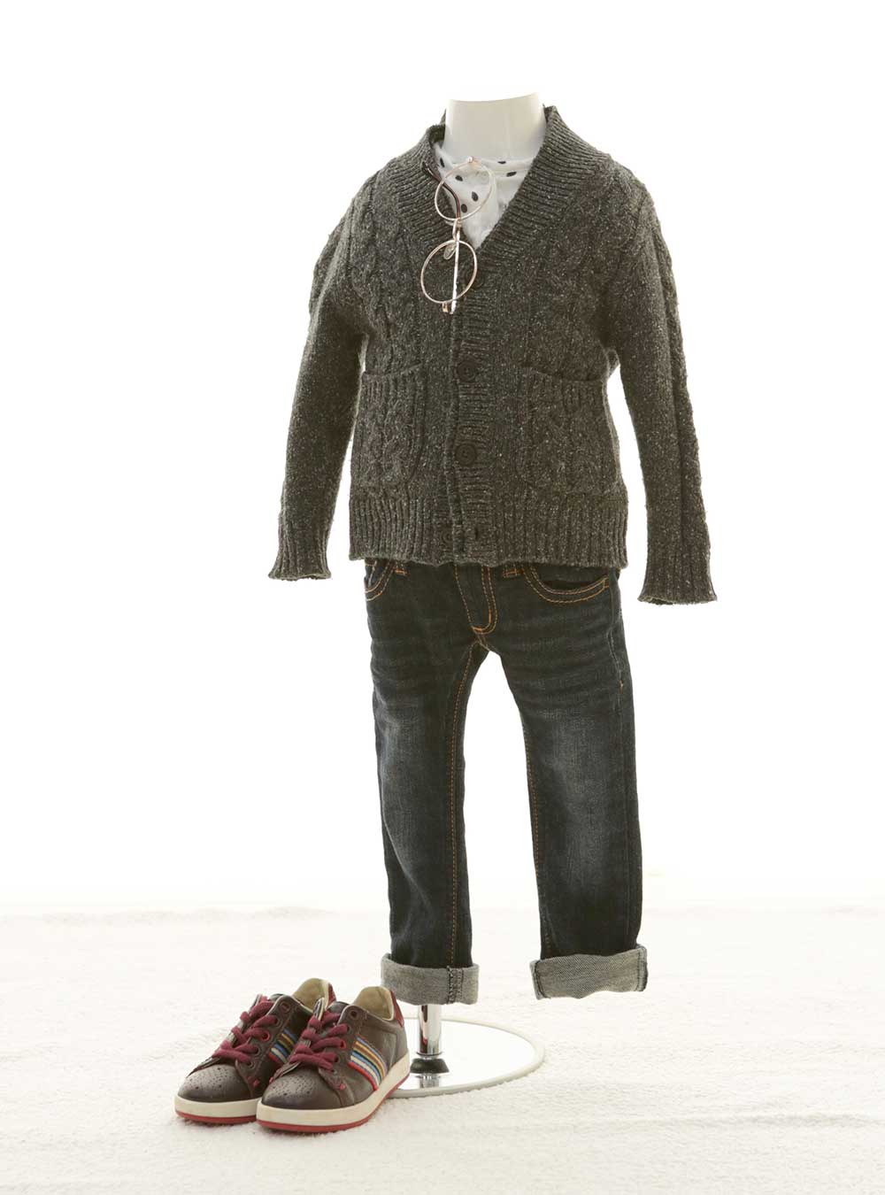 厚手のグレーカーディガンとヴィンテージ感のあるデニムの組み合わせが、カジュアルながらも大人っぽい雰囲気を醸し出します。ナチュラルカラーを基調としたこの装いは、シンプルの中にも存在感を感じられる一着です。 撮影の際にはめがねなどのアイテムもプラスし、おしゃれボーイに大変身。