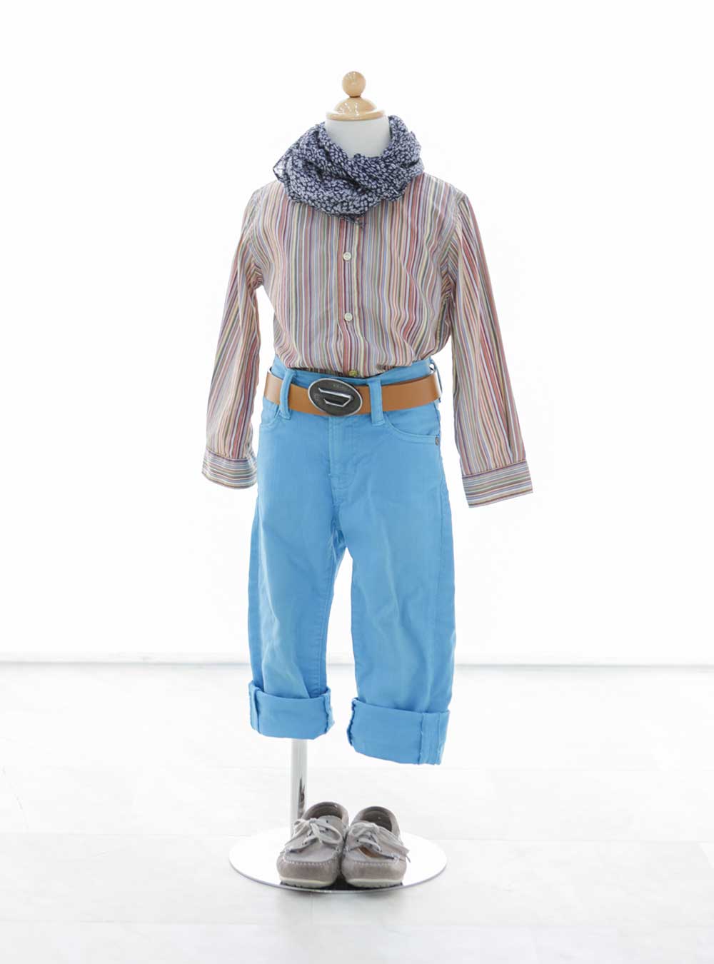 PaulSmithのストライプシャツに爽やかなスカイブルーのパンツが映える衣装。子供らしさの中に大人の爽やかさや涼しさを感じられる一着です。 格好良いスタジオ背景にも合い、ショールやハット、眼鏡などの小物をプラスして色んなパターンで撮影をお楽しみいただけます。
