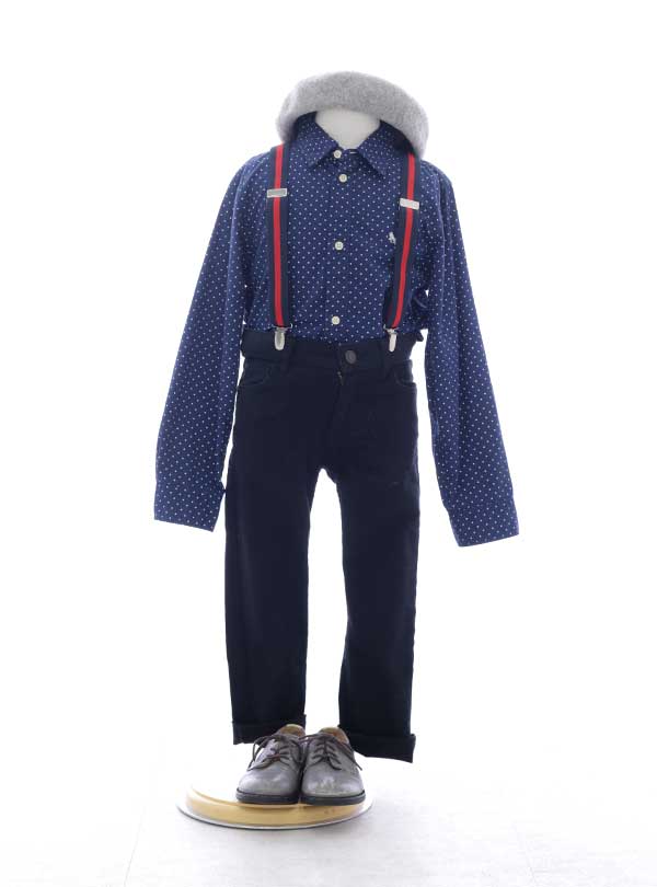 ネイビーの長袖シャツに黒色のパンツを合わせたカジュアルな衣装。落ち着いた色味の中でシャツのドット柄やサスペンダーの赤色が遊び心を演出しています。シャツやパンツはロールアップし、今っぽいカジュアルな着こなしがかっこいいスタイリングです。