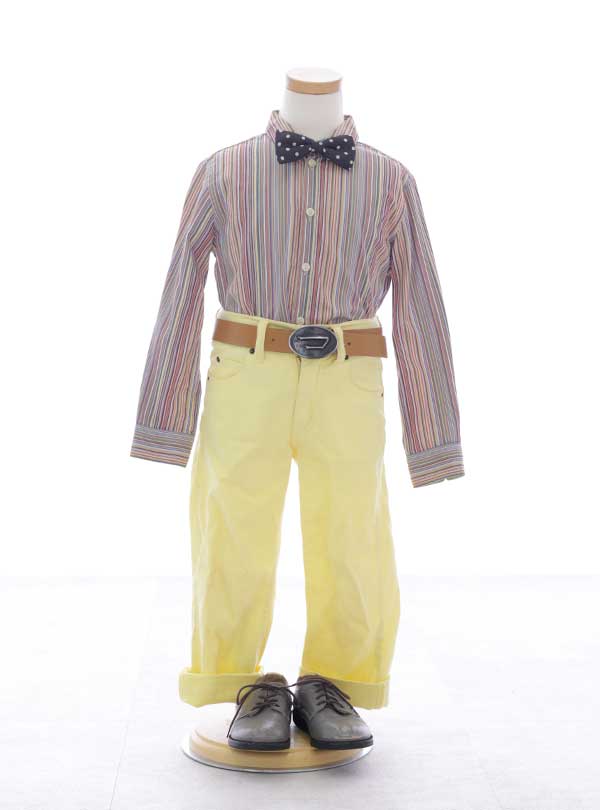 ポールスミスの代表的なカラフルストライプシャツにイエローパンツを合わせたカジュアルな衣装。ノーネクタイで襟元のボタンを開けたスタイリングや、腕まくりをしてラフなスタイリングにしてよりカジュアルを楽しむこともできる衣装です。