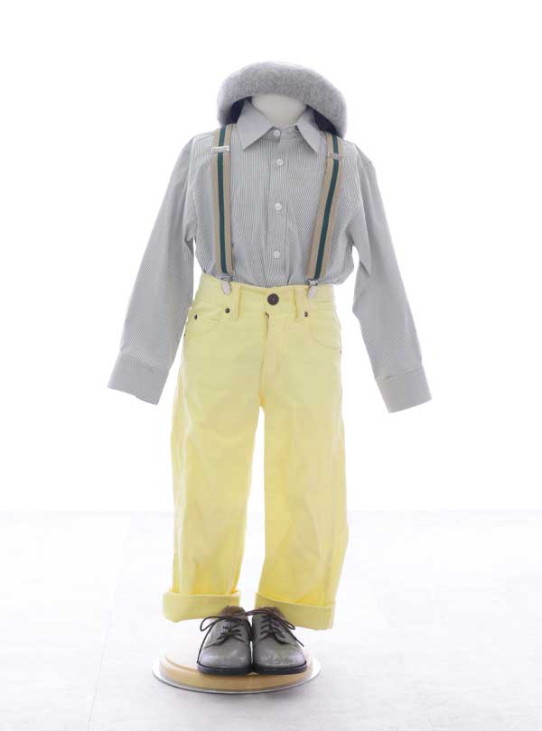 グレーのシャツに、イエローパンツを合わせたカジュアルな衣装。グリーンのラインがお洒落なサスペンダーがアクセント。 シャツやパンツはロールアップし、今っぽいカジュアルな着こなしが可愛いスタイリングです。グレーのベレー帽をかぶってよりレトロなスタイリングにするのもおすすめです。