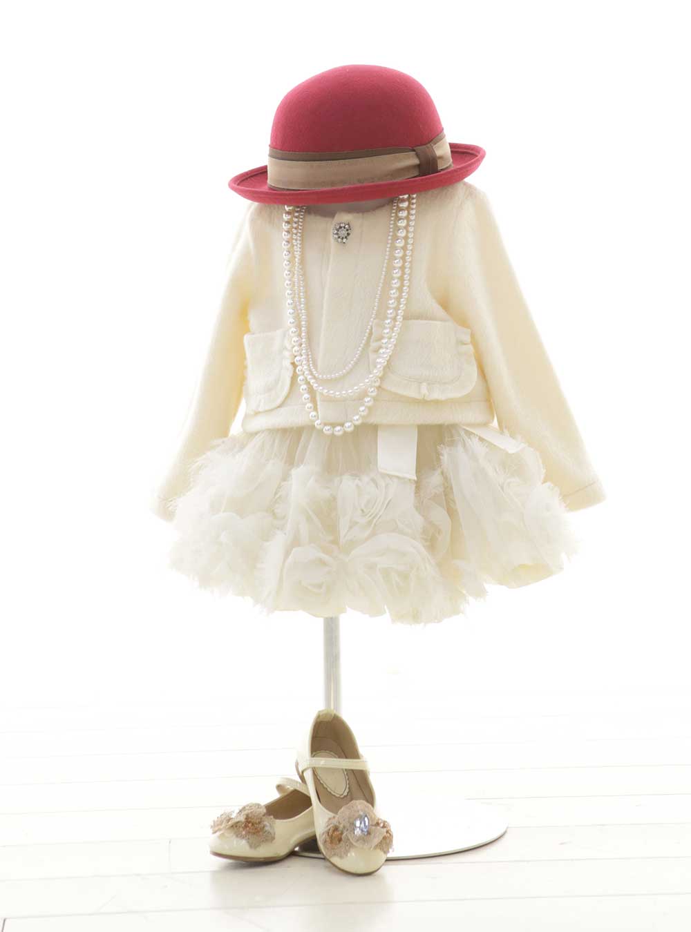 肌馴染みの良い明るいベージュカラーのカーディガンは、モヘアニット素材でできており、柔らかい素材感が特徴です。 ワンポイントでビジューのボタンが一つ付いており、上品な印象を与えます。スカートはチュール素材をふんだんに使い、動くたびにふんわりと広がる女の子らしいデザインです。