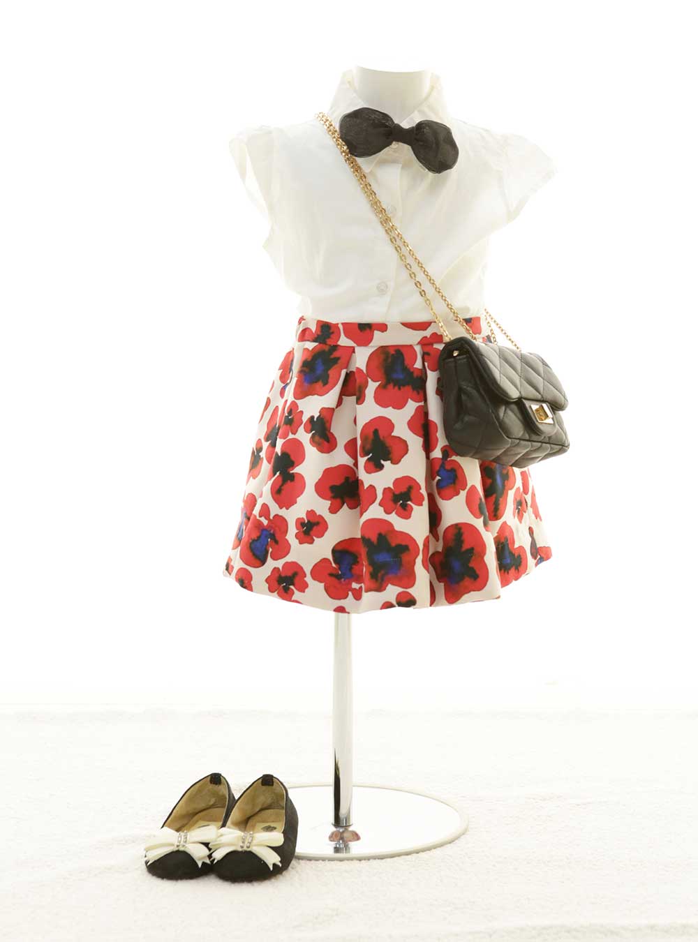 人気子供服ブランド【Sweet Room】のブランド衣装。シンプルな白シャツに、黒の蝶ネクタイ。この蝶ネクタイは素材感にもこだわりシアー感のあるオーガンジーで作られています。 そしてスカートは花のモチーフのプリントが存在感抜群。どこかレトロモダンな雰囲気の衣装です。