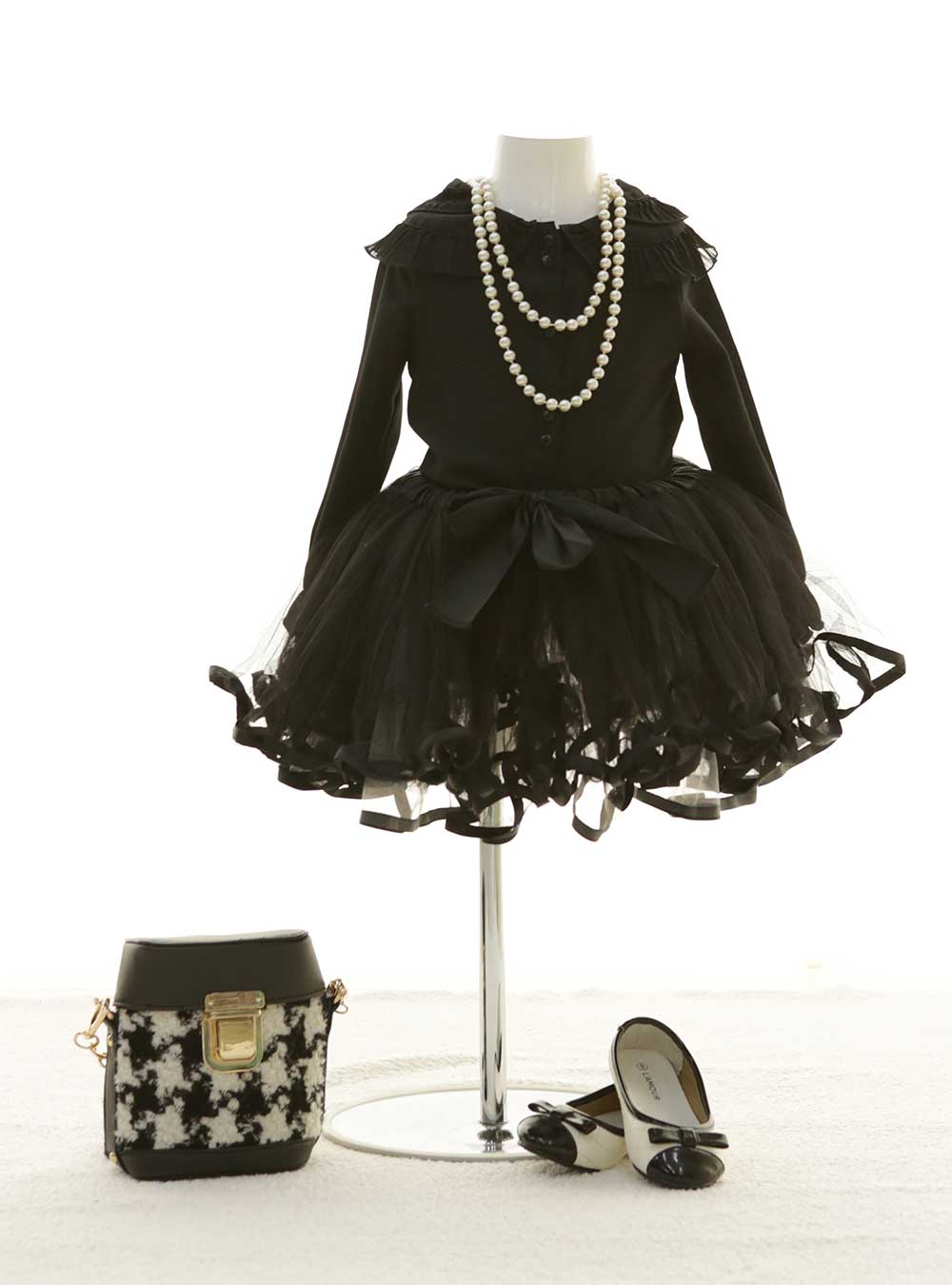 人気子供服ブランド【Sweet Room】のブランド衣装。黒のブラウスはフリルの丸襟が特徴でシンプルなデザインの中にこだわりが見えます。ボリュームのあるチュチュスカートはオールブラックで甘いデザインをかっこよく仕上げます。 アクセサリーもボリュームのあるものと合わせたり、パンプスやブーツと合わせる事で少し背伸びをした大人っぽいお洒落を楽しむことができます。