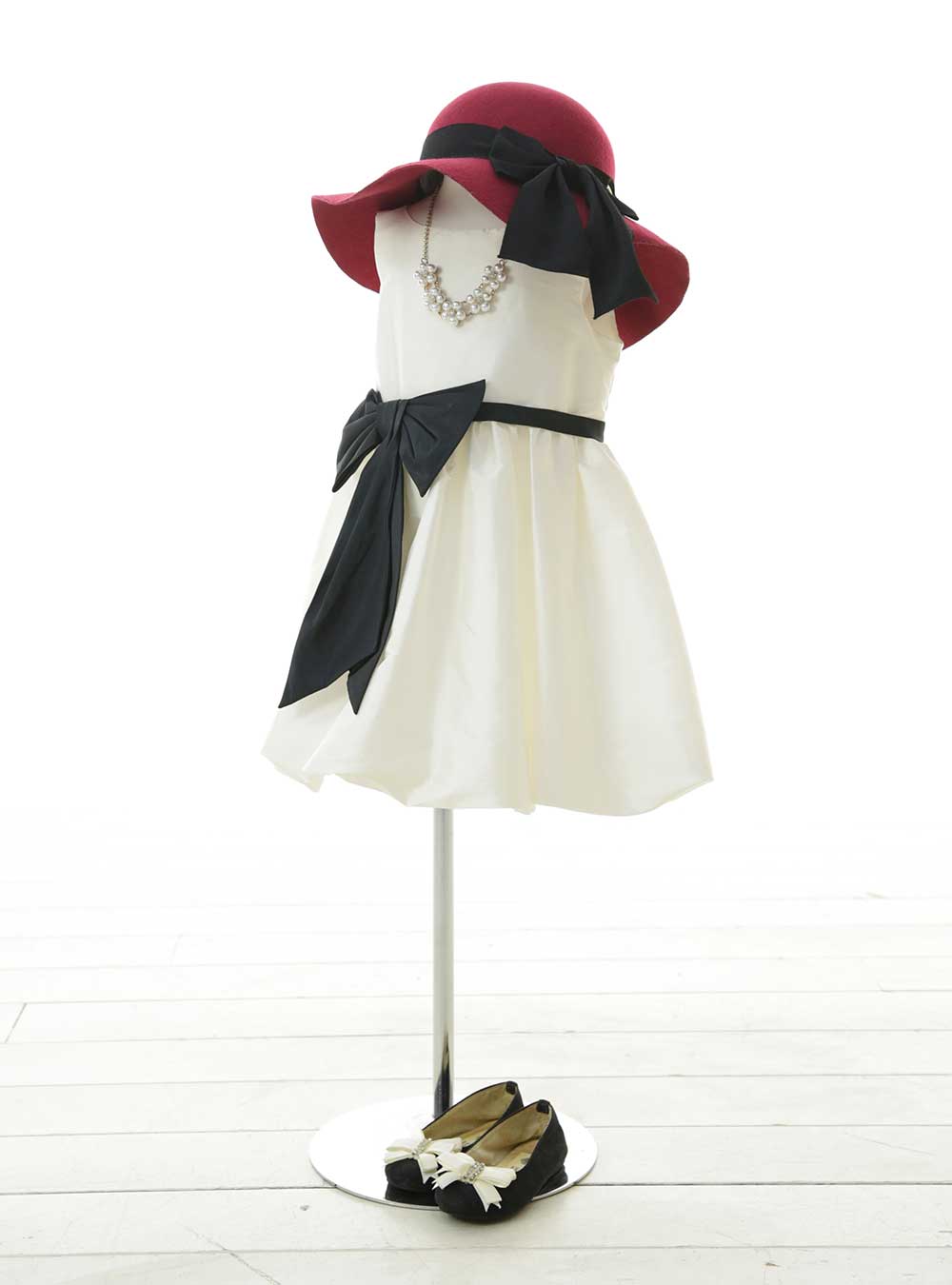 真っ白なワンピースに黒の大きなリボンが付いたこの衣装は、シンプルなコーディネートが好きな方におすすめの一着です。 ウエストのリボンを黒色にしていることでデザインにメリハリがつきスタイリッシュな印象になります。帽子やパンプスを合わせて大人っぽくコーディネートをお楽しみいただけます。
