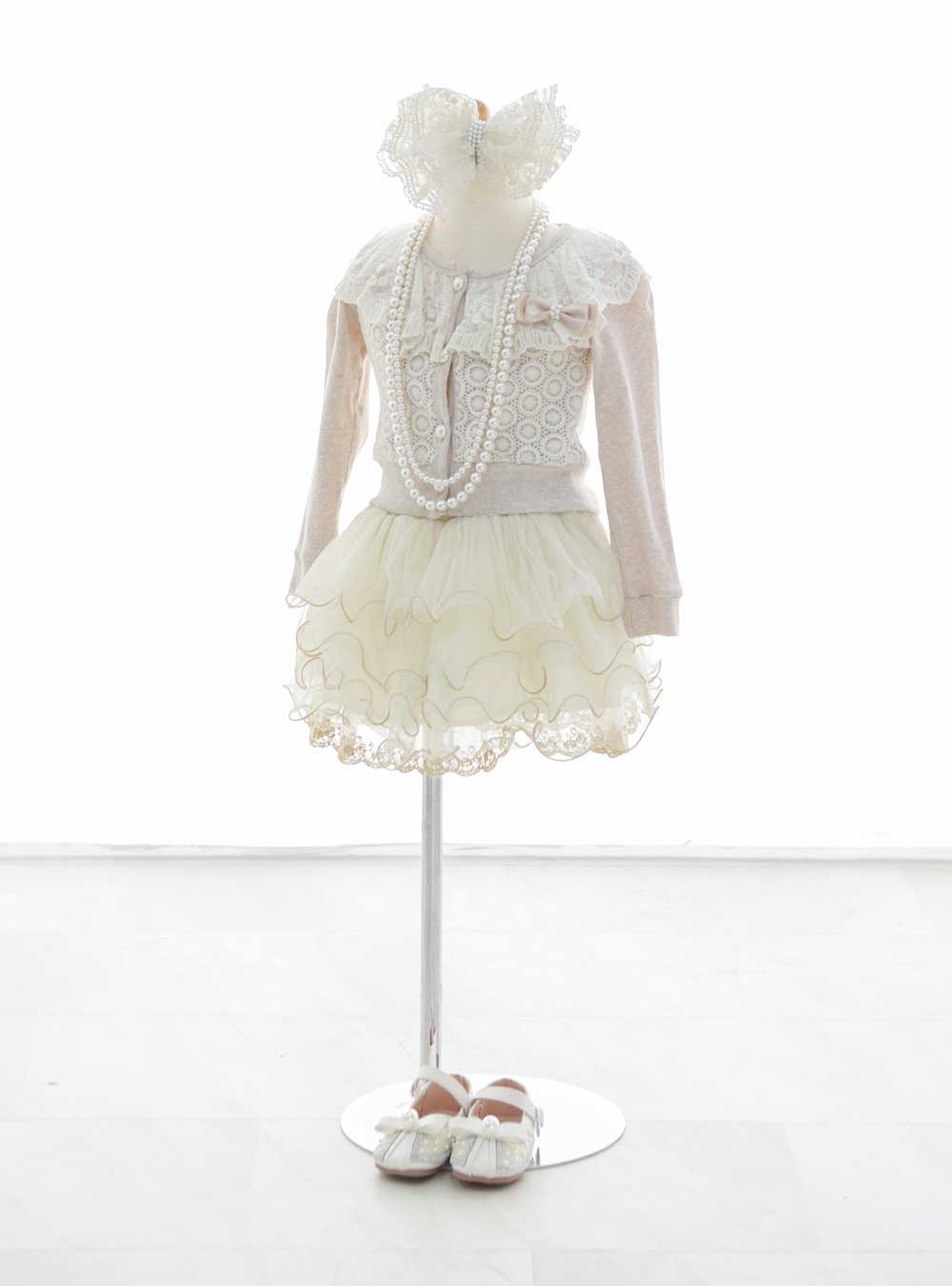 優しいピンクベージュのカーディガンに白いレースの襟元が特徴の上品さと可愛さを兼ね備えた一着です。ボリュームのあるベージュのフリルスカートを合わせる事によって、よりキュートな印象になります。 薄手の素材感でつくられており、淡い色味の衣装なので季節感問わずに着ていただけます。