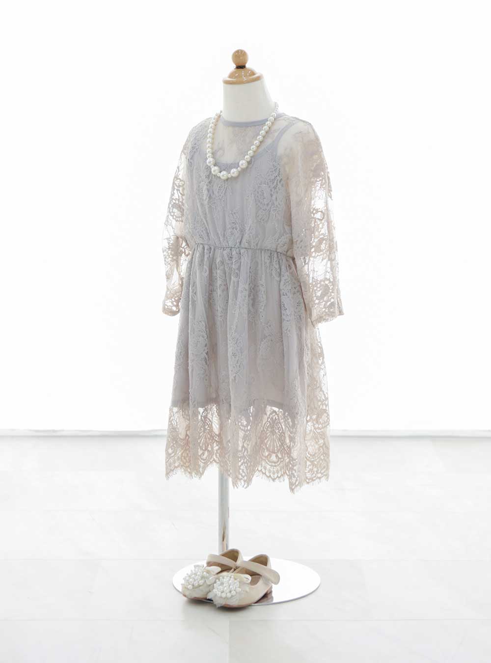 明るいグレーのワンピースはレースの生地感が柔らかい上品な印象を与えます。お揃いで6~7歳用サイズもご用意しており姉妹お揃いショットでもご利用いただけます。 フォーマルな雰囲気も兼ね備えているのでメイン撮影のお子様だけでなく、家族撮影で参加するお子様などにもおすすめです。