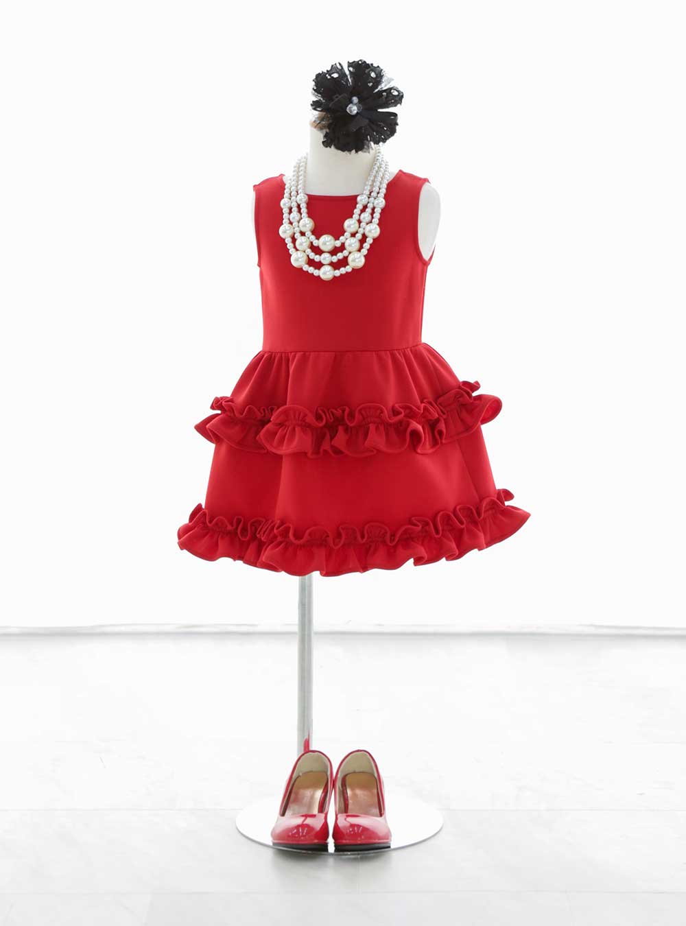 真っ赤なフリルが特徴のこのワンピースは厚みのある素材感で高級感があり、かつクラシカルな印象に仕上がります。アクセサリーはパール系、帽子やヒールと合わせる事でより雰囲気にマッチし、まるで海外女優のような着こなしに。 海外衣装の中でも人気のワンピースで、普段とは違った雰囲気で撮影が出来る一着になります。