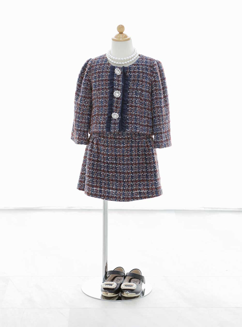 ツイード素材で上品な印象のセットアップ。秋冬の季節感を感じるツイード生地には紺色のラインがアクセントで入っており、ジャケットにはパールの装飾が施されています。 色違いの赤のツイードセットアップもご用意しておりますので姉妹お揃いでの着用も可能です。