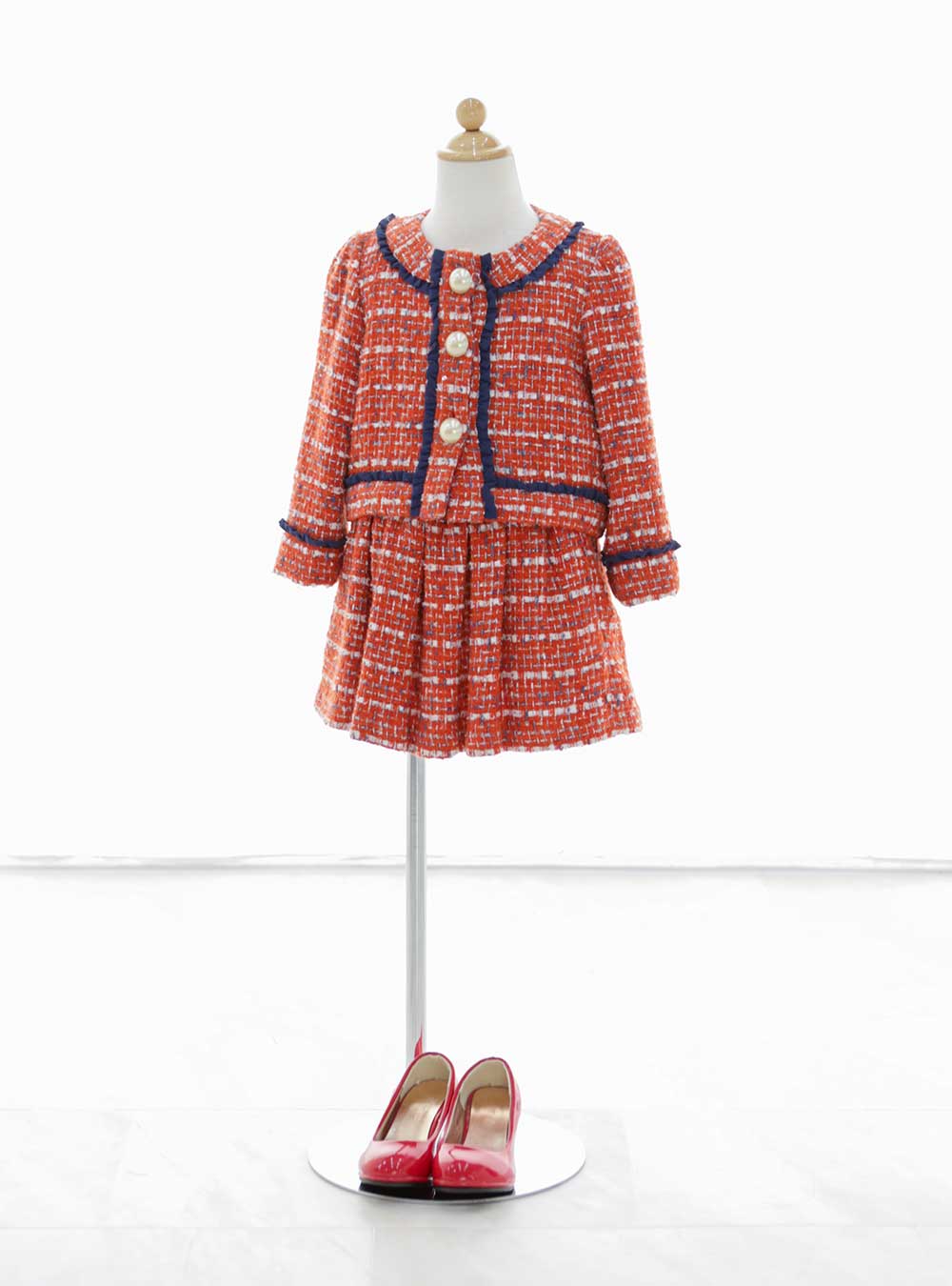 ツイード素材の上品なセットアップ。秋冬の季節感を感じるツイード生地には紺色のラインがアクセントで入っており、ジャケットにはパールの装飾が施されています。 色違いの紺色ツイードセットアップもご用意しておりますので姉妹お揃いでの着用も可能です。