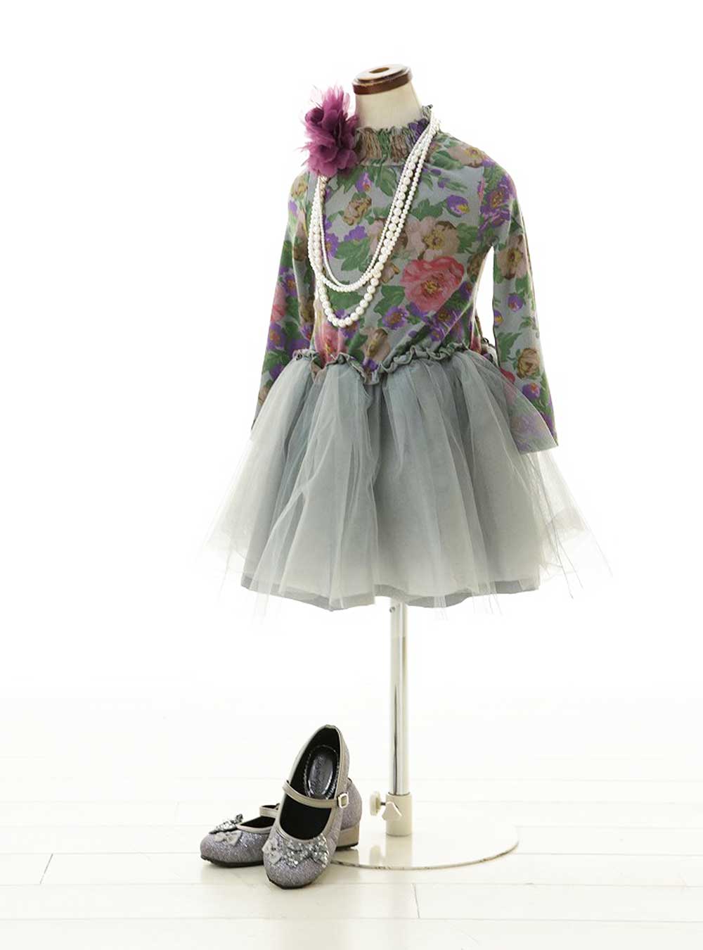 花柄のトップスとグレーのチュールスカートが調和したフェミニンなスタイル。パールのネックレスが華やかさを加え、全体に優雅な雰囲気を醸し出しています。シルバーのパンプスで上品にまとめました。