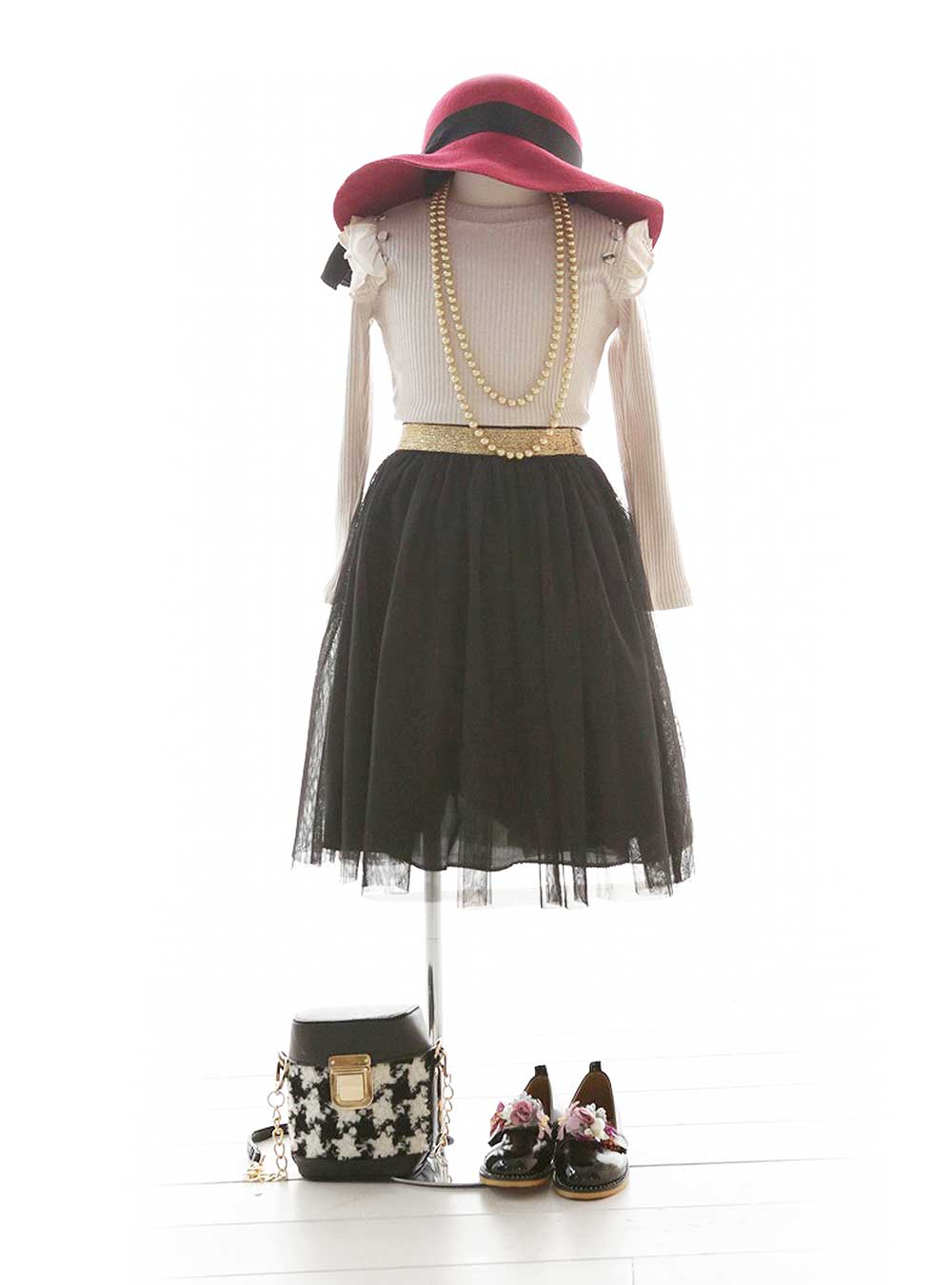 華やかな赤のつば広帽子がアクセントのコーディネート。シンプルなベージュのトップスに黒のチュールスカートを合わせ、ゴールドのネックレスが上品さをプラスしています。 千鳥格子柄のバッグとフラワーモチーフのシューズが遊び心を演出します。