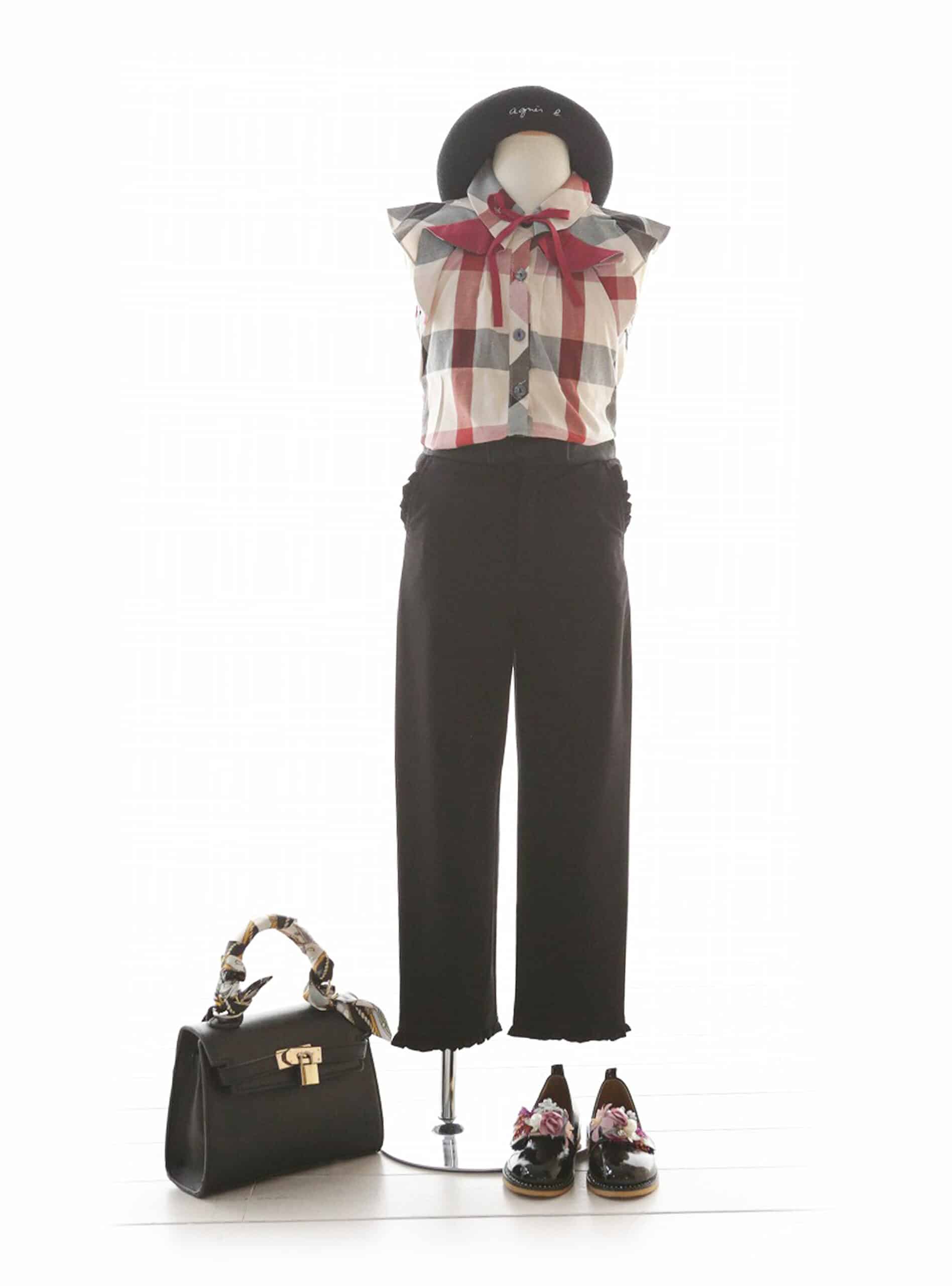 レッド、ブラック、ベージュの組み合わせが可愛いシャツを主役にしたコーディネート。フリルの袖と、首元のリボンがポイントです。 パンツや小物を黒ですっきりとまとめつつ、ベレー帽やローファーといったクラシックな小物でフレンチカジュアルに仕上げました。