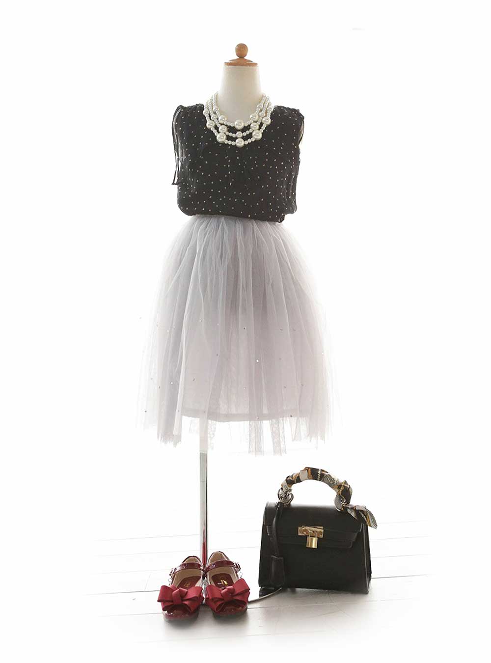 モノトーンのドット柄のトップスは、シフォン素材で上品に。グレーのチュールスカートを合わせて、優しい雰囲気をプラス。 大きなリボンのパンプスは、赤をチョイスして差し色に。かっちりめのバッグを合わせてクラシックにまとめたコーディネートです。