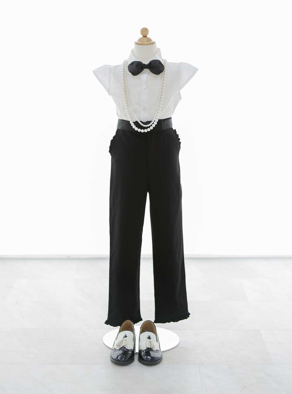 胸元の丸みのある蝶ネクタイや、ふわっと立ち上がるフレンチスリーブ、パンツにあしらわれた細かいフリルがキュートなアクセントになったコーディネート。落ち着いた印象になりがちなモノトーンを、どこかお茶目なスタイルにブラッシュアップしました。 パールのネックレスで、きちんと感も忘れずに。今だからこそ楽しめるコーディネートです。