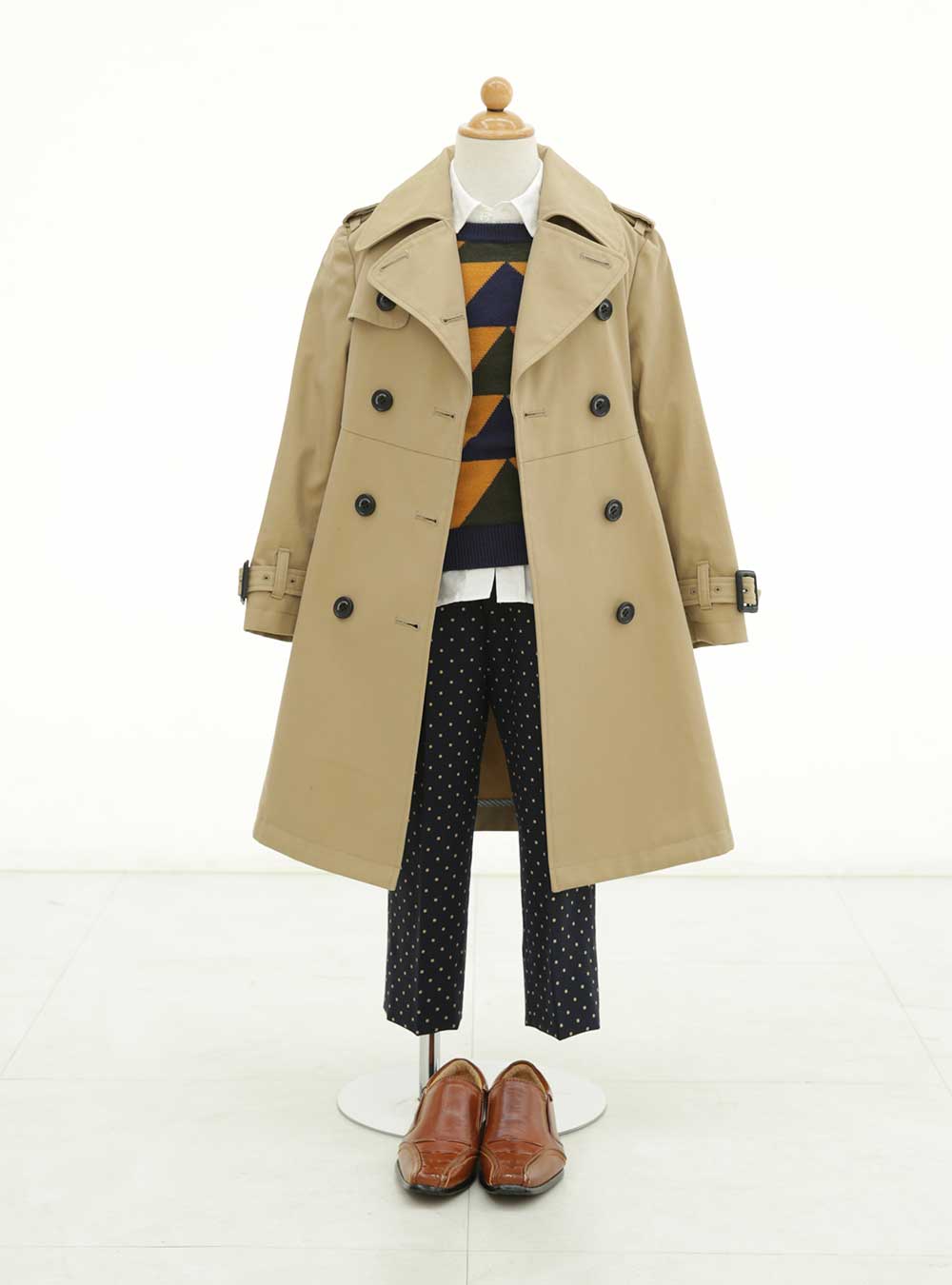 トレンチコートがメインのコーディネートで、ベージュカラーでクラシック印象を与え、スタイリッシュな雰囲気を演出♪ 中に着ている三角形柄のセーターはカジュアルなアクセントを与え、シャツの上に重ねることでおしゃれに、全体の印象をやわらかく見せます。パンツのドット柄で個性派を演出します。