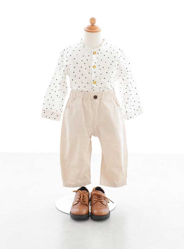 ドット柄のトップスとベージュのパンツの組み合わせで、シンプルながらもオシャレなデザインです。トップスは黄色いボタンがアクセントに♪ ナチュラルなカラーのパンツと組み合わせることで、優しい印象を与えます。衣装がシンプルなため背景を選ばず、様々な小物や自然な動きで簡単に雰囲気を変えることができ、可愛らしい写真を残せます。