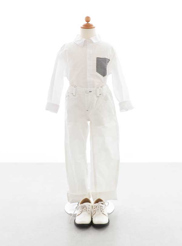 オールホワイトのコーディネートは、清潔感とスタイリッシュさのあるセレクト衣装。トップスの胸ポケットにはチェック柄のアクセントが入っており、さりげないおしゃれなポイント♪ パンツはシルエットがすっきりとしておりスタイリッシュさをプラス!オールホワイトのコーディネートでどの背景とも相性バッチリ!爽やかに着こなせます。