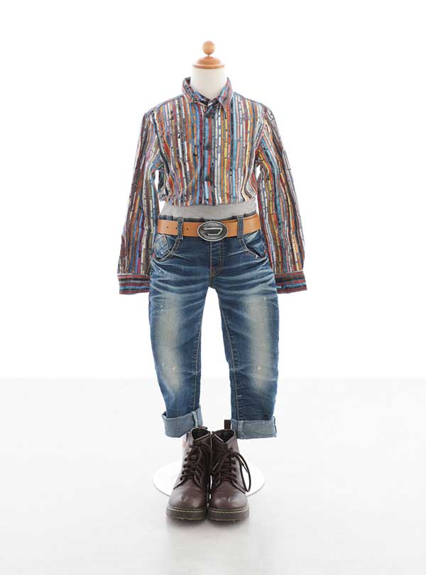 シャツ×デニムでカジュアルながらも個性的なセレクト衣装。カラフルなストライプシャツは、個性的なデザインで子供らしい元気さが感じられます。 デニムパンツは程よいフィット感と色落ち加工が施されており、カジュアルな印象を♪ウエストには存在感のあるベルトがアクセントとなり、シンプルなスタイルでストリート要素も楽しめる1着