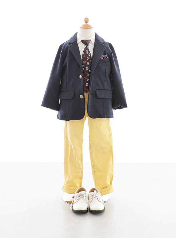 明るいイエローのパンツと、小物でこなれ感のあるセレクト衣装。ネイビーのジャケットは、しっかりとしたシルエットとポケットチーフがアクセントとなり大人っぽくなります。 インナーの白いシャツに合わせた個性的なデザインのネクタイが、遊び心があってさりげなくおしゃれ度をアップ!イエローのパンツが、明るく元気な印象をプラスした1着♪
