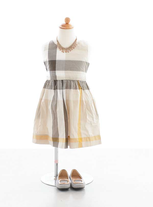 ベージュ・ブラウン・黄色のチェック柄ワンピース。トップス部分はボディラインが出るようなややタイトなデザインで太めのチェック柄が入っています。スカート部分は細かなギャザーが入っていてふんわりと広がります。 上下のチェックの太さや色味が違うのが控えめなオシャレポイント!秋カラーの可愛いセレクト衣装。