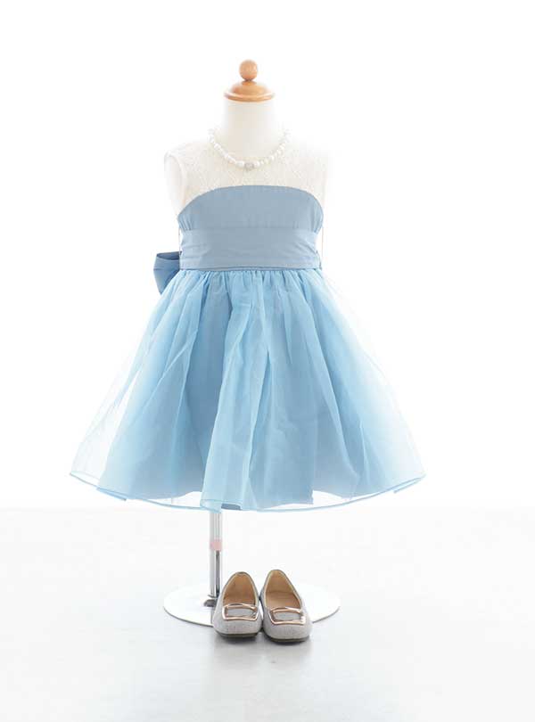 爽やかな水色のワンピース。トップス部分とスカートの生地感が違い、スカートはチュールが重なったふんわり広がるフレアデザイン。 トップスは白と水色のバイカラーでラウンド型のカットが可愛い!ウエストは同じ色味の太めのラインでウエストマークしてあり、後ろでリボン型に結ぶ為、後ろ姿も可愛く撮影できます!