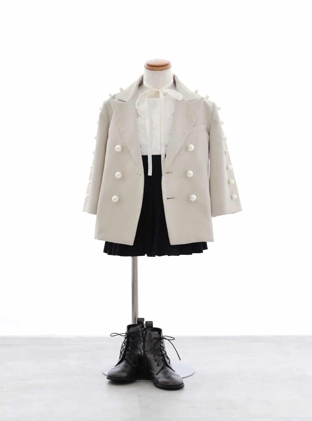 袖やボタンにたくさんのパールがデザインされたジャケット。インナーから見えるフリルが特徴的で首元のリボンのチョーカーがキュート♡ プリーツスカートはブラックの締め色でキュートながらもエレガントな印象を与える1着です。