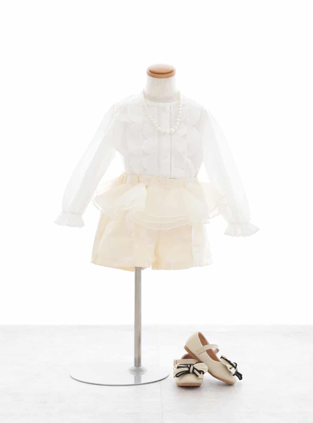クリーム色と白を基調とした、淡く優しい色合いのコーディネート。 トップスは花びらを重ねたような立体感のある模様で、袖のフリルも可愛らしいです。清楚で女の子らしい雰囲気に、フリルとパールのネックレスが上品さをプラスしています。特別な日にぴったりの華やかさで、お子様の笑顔がさらに輝くこと間違いなしのコーディネートです。