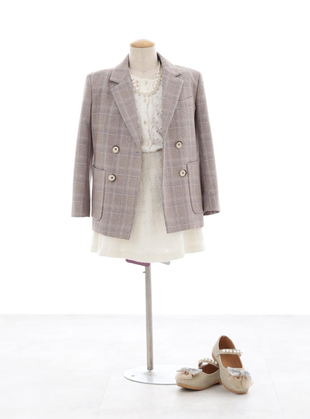 ピンクベージュのチェック柄ダブルブレストジャケット。 落ち着いたカラーとチェック柄がトラッドな印象を与え、フォーマルながらもカジュアルな印象に。 シックなジャケットとフェミニンなレースブラウス&スカートの組み合わせで、大人っぽさと可愛いらしさを兼ね備えたスタイルの1着です。