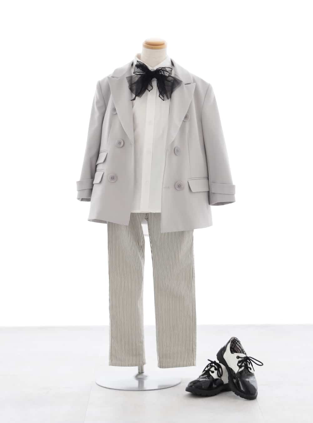グレーのダブルブレストジャケット。 ゆったりとしたシルエットで、フォーマルながらも柔らかい印象を与えます。パンツはジャケットと同じグレーのパンツ。ストレートなシルエットでシックな雰囲気を演出します。 首元にはブラックのリボンが結ばれ、クラシカルでエレガントさをプラスしています。全体的にヴィンテージ感のあるフォーマルコーディネートです。