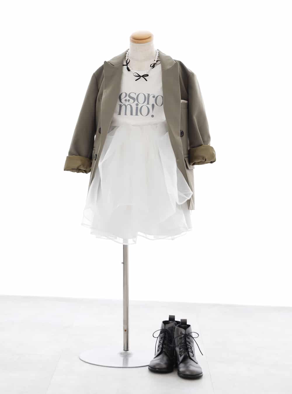 フロントのロゴが目を引くTシャツに、ふんわりとしたホワイトチュールスカートを合わせたガーリーな組み合わせ。 カジュアルなジャケットをプラスすることで程よいミリタリー感を演出。足元には、シルバーブーツで全体を引き締め甘さとカジュアルさをバランスよく楽しめるコーディネートになっています。