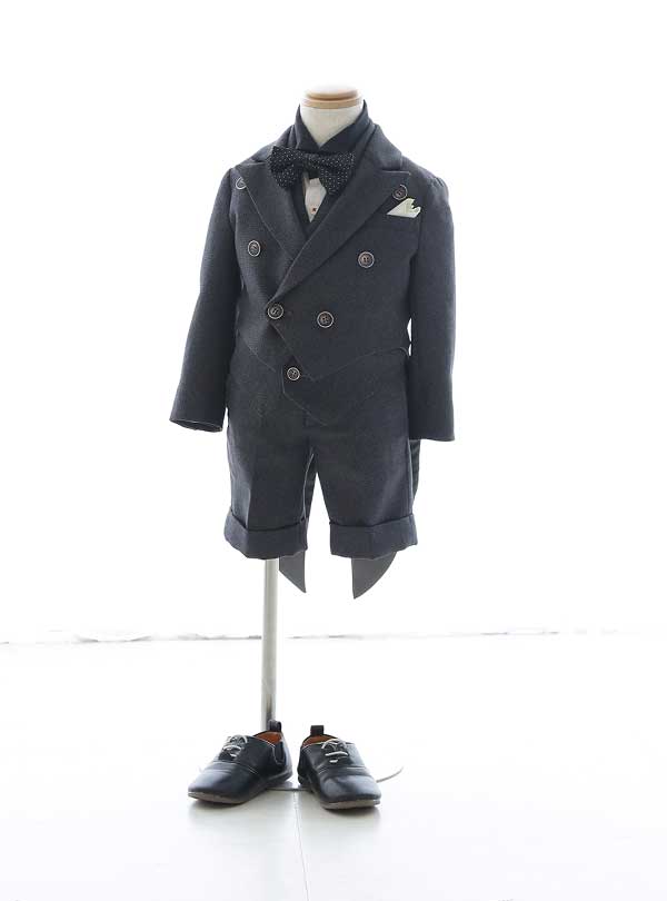 上品なチャコールグレーを基調としたダブルブレストのジャケットは、精巧な仕立てが際立ち洗練されたシルエットを作り出しています。グレーのベストと白いシャツを合わせ、コントラストの効いた黒のドット柄の蝶ネクタイが首元を引き締めます。 シンプルなデザインでありながら全体のコーディネートに上品なアクセントを加えています。