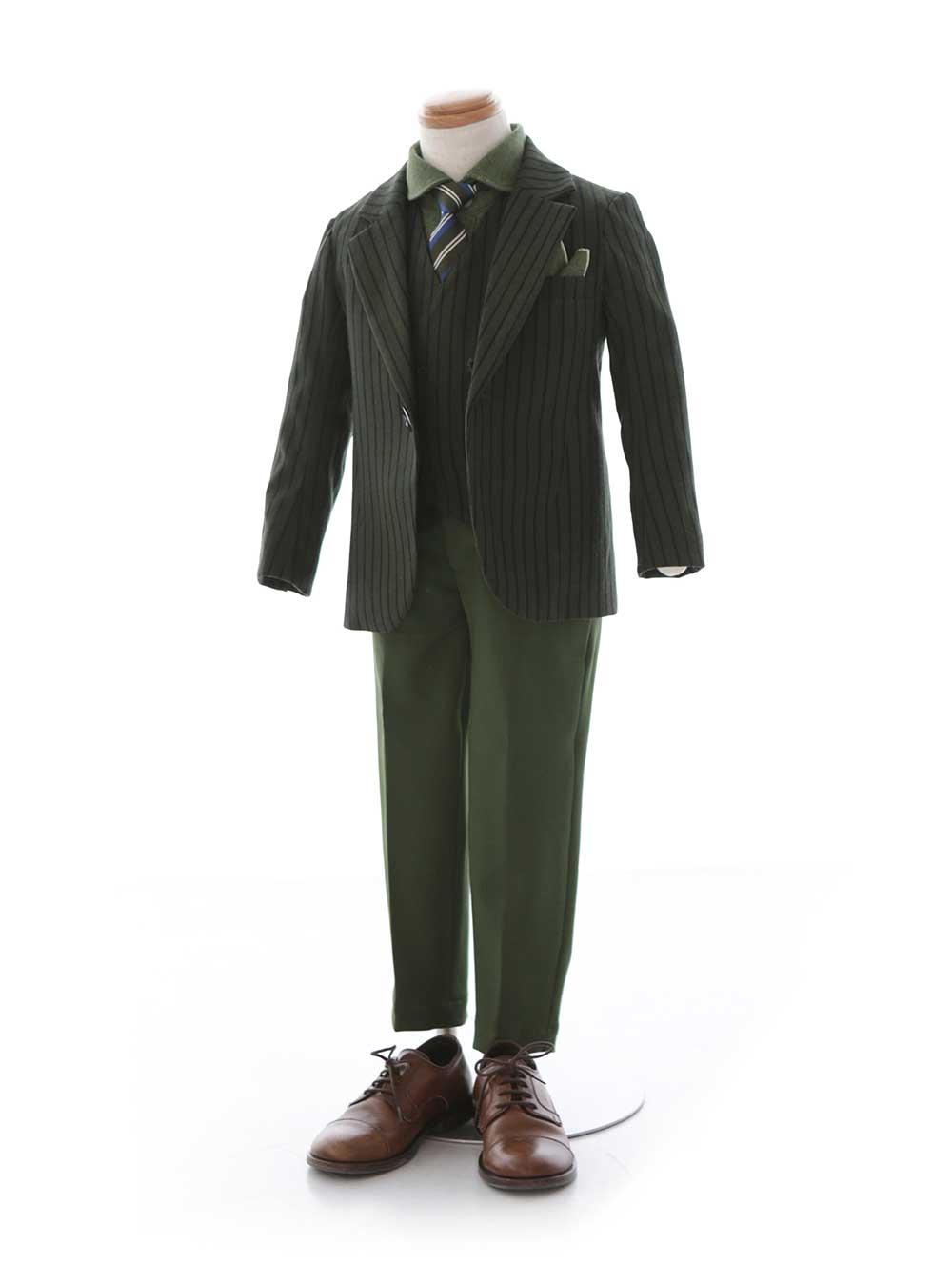 グリーンカラーで統一された高級感のあるデザインで、ジャケットは細やかなストライプ柄がアクセントになり、上品な印象を与える。シャツも厚手のデザインになっており、大人っぽく着こなすことができます。 青とグリーンのストライプ柄のネクタイでフォーマル感を出している。華やかな背景でも、落ち着いた色味のため調和が取れよく映えます。