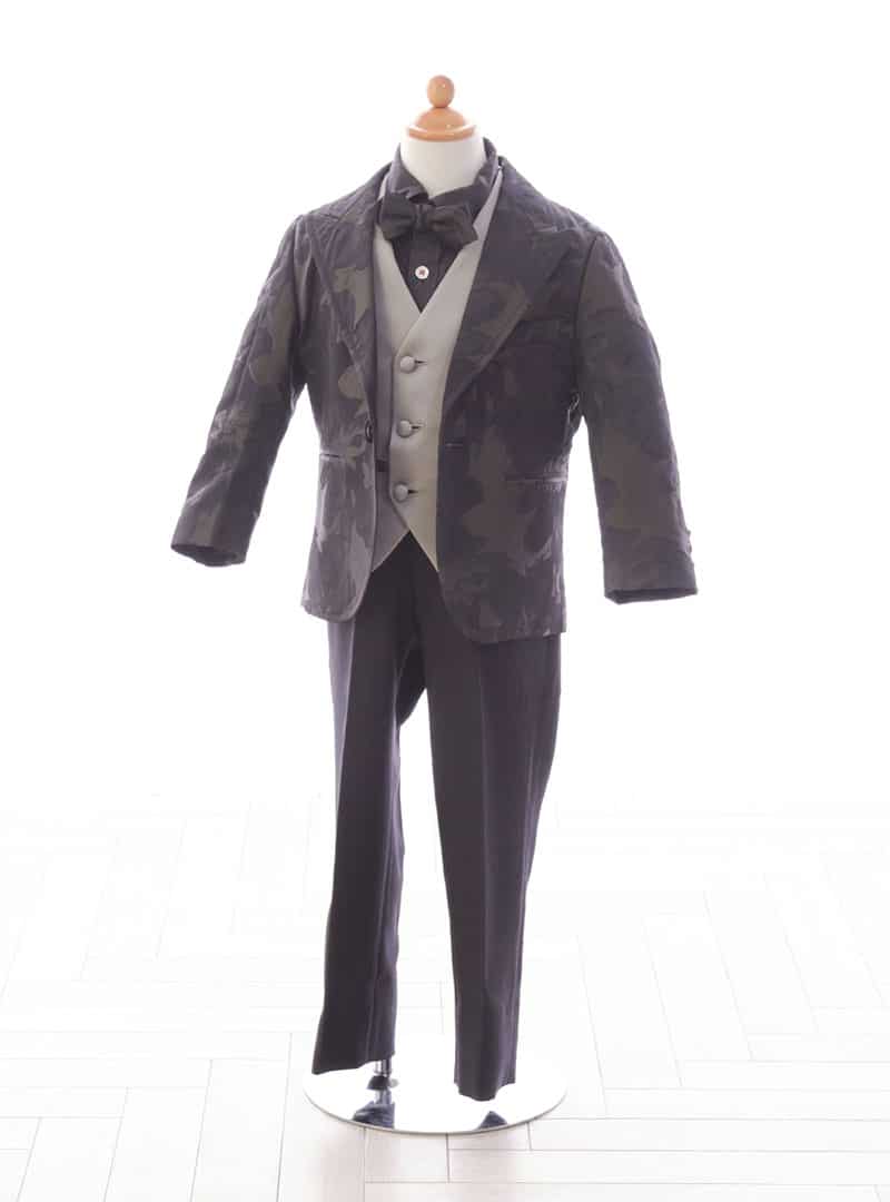 ダークトーンのジャケットにカモフラ風の花柄のアクセントが映え、ベージュ系ベストが優しい印象をプラス。 上質な黒シャツと蝶ネクタイ、シンプルな黒パンツが調和した上品なデザインです。 細部にまでこだわった仕立てが、魅力を引き出し、大切な日の思い出に彩りを添えます。