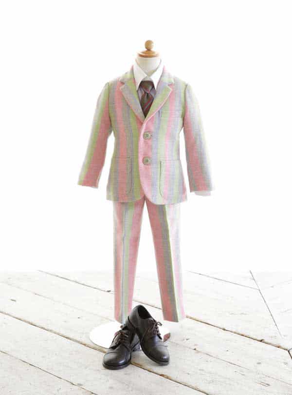 カラフルなスーツが思わず目を奪われる、ユニークで遊び心あるデザインが特徴的です。 ピンク、黄緑、グレーが見事に組み合わさり、見る人を楽しませる鮮やかで華やかなコーディネートです。 深緑と赤のネクタイが、カラフルなスーツに落ち着きを加え、引き締まった印象に。お子様の個性を最大限に引き出すことができる一着です。
