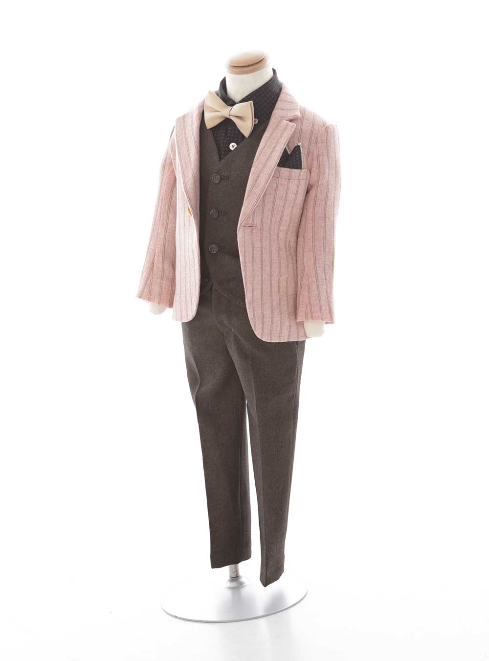 淡いピンクジャケットは、存在感がありつつもエレガントで、他のアイテムと絶妙なバランスを保ちながら全体に華やかさを添えています。 ブラウンのベストは、ピンクのジャケットと対照的な温かみのあるトーンを取り入れ、落ち着いた印象をプラスします。ベージュの蝶ネクタイがピンクとブラウンの色合いを引き立て、お子様らしい可愛らしさを引き出します。