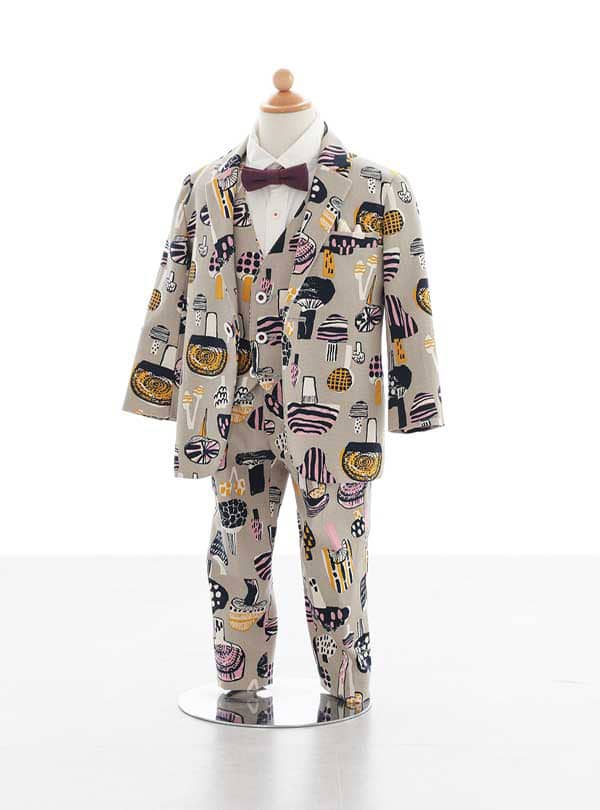 きのこ柄がユニークで、遊び心溢れるデザインが魅力のスーツです。全体に散りばめられた愛らしいきのこモチーフは、お子様の個性と元気さを引き立て、見る人の心を和ませるポップで楽しい印象を与えます。 きのこの形や色使いは様々で、お子様らしい明るさとユーモアさを存分に表現できます。