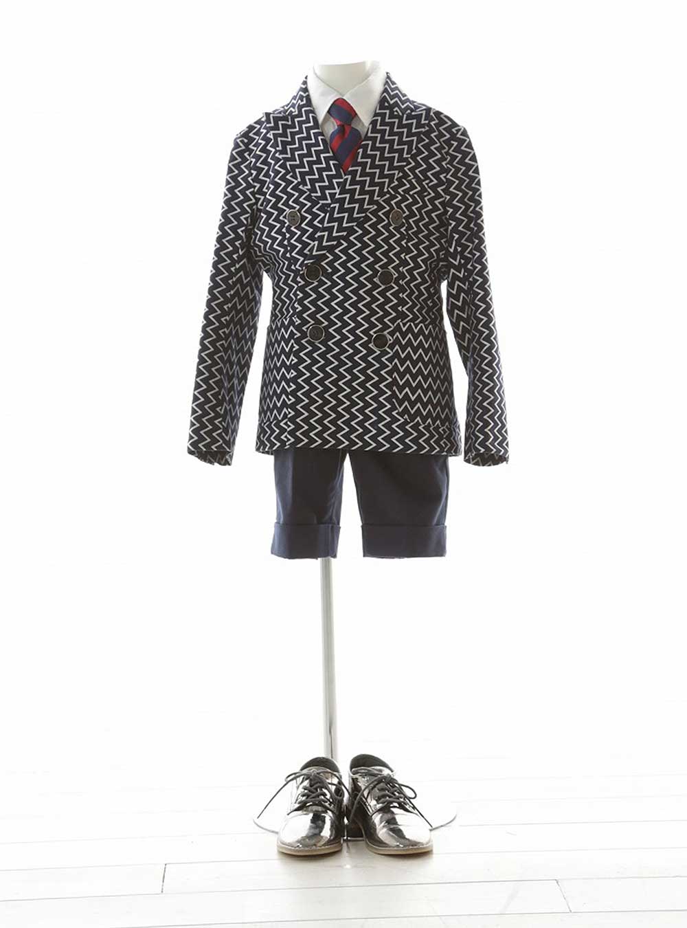 個性的かつモダンなデザインが特徴の衣装です。ダブルボタンのジャケットにはジグザグ模様があり、視覚的に強いインパクトを与えます。黒と白のコントラストが際立ち、洗練された雰囲気を出しています。 ジャケットの下にはクラシカルなネクタイを合わせ、全体のバランスを保ちながらもスタイリッシュさを強調しています。
