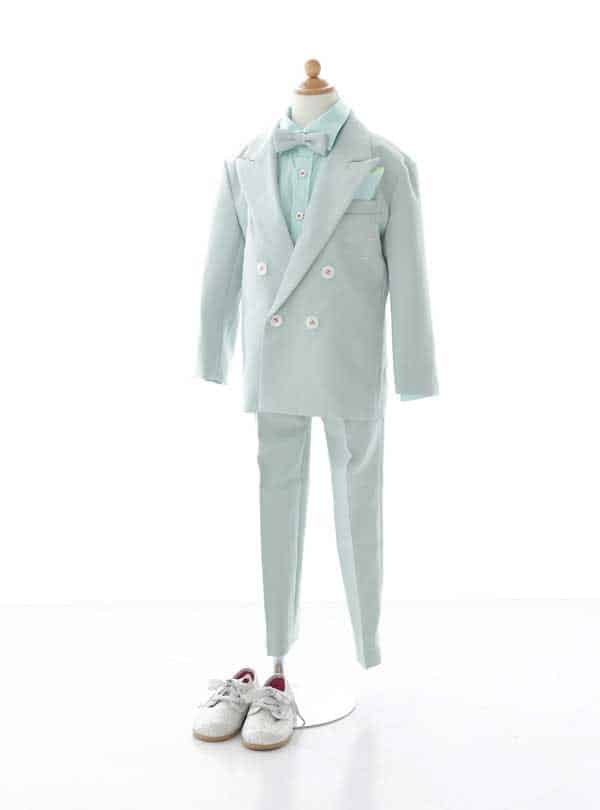淡いミントグリーンの落ち着いた色合いが特徴的です。ジャケット、パンツ、シャツ、蝶ネクタイ全て同じ色合いのものになるので、統一感のある上品なコーディネートになっています。 胸元のポケットにはさりげなくポケットチーフが挿されており、オシャレさも兼ね備えています。さわやかな感じの写真や淡い色味が好きな方におすすめです。
