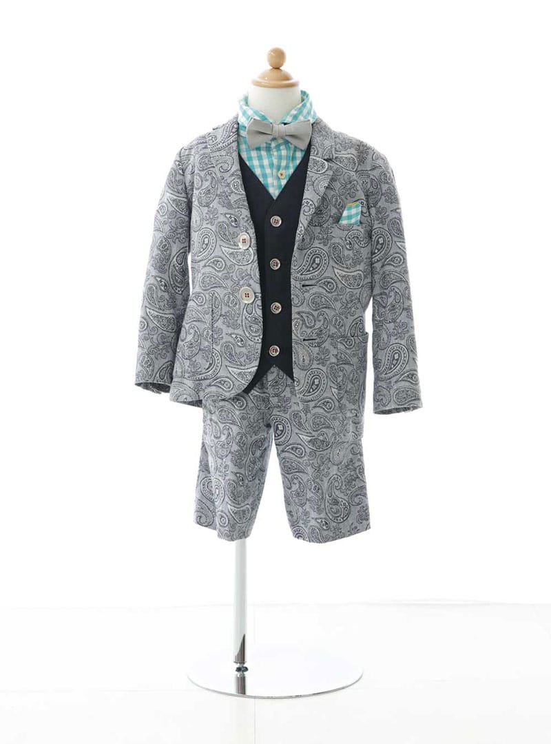 ペイズリー柄のタキシードはシンプルな色合いでありながらも遊び心が感じられるスタイルです。グリーンチェックのシャツはタキシードとのコントラストを楽しむとともに元気でカジュアルな印象を加えます。 緑の蝶ネクタイが全体に鮮やかさをプラスし、コーディネートを引き立てます。ハーフパンツなのでお子様も動きやすい衣装です。