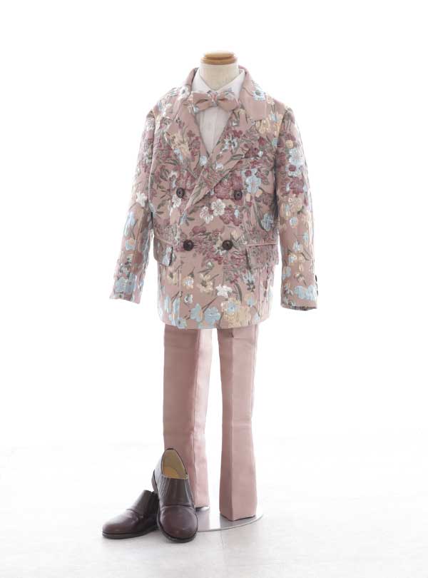 くすみピンクにカラフルなお花がたくさん刺繍されたタキシードです。お花の刺繍は光沢感がありピンクのタキシードをかっこよくまとめてくれています。 ジャケットはダブルボタンになっており、パンツはセンタープレスが入っているため、タイトでスマートな印象の1着です。7歳のお姉ちゃんとお揃いで着ることもできます。