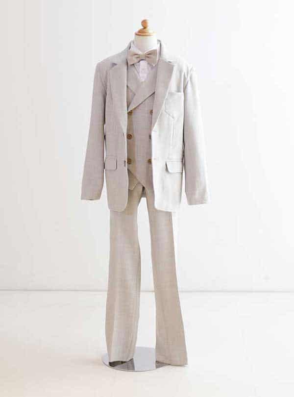 洗練されたデザインと高級感を兼ね備えたタキシードです。柔らかなベージュのジャケットは上品でありながらもカジュアルさを感じさせます。ジャケットのシルエットはシャープで洗練された大人の魅力を引き立てます。 ベストとパンツも同色でコーディネートされており、全体の統一感が魅力でスタイリッシュな印象を与えます。