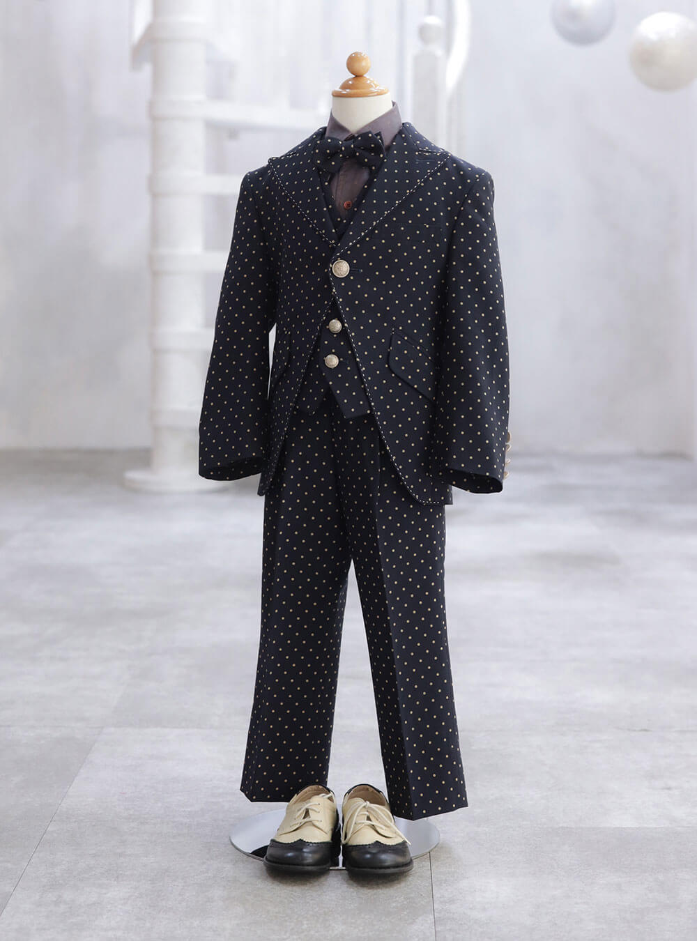 クラシックな紺色のスーツに繊細なドット柄をあしらった、洗練されたデザインが特徴の一着です。ドット柄は控えめながらも個性的なアクセントとしてスーツ全体に軽やかさをプラスしています。 ボトムスも同じくネイビーのドット柄で統一され、全体のコーディネートに一貫性を持たせています。シャープなシルエットがお子様の可愛さを引き立てる一着です。