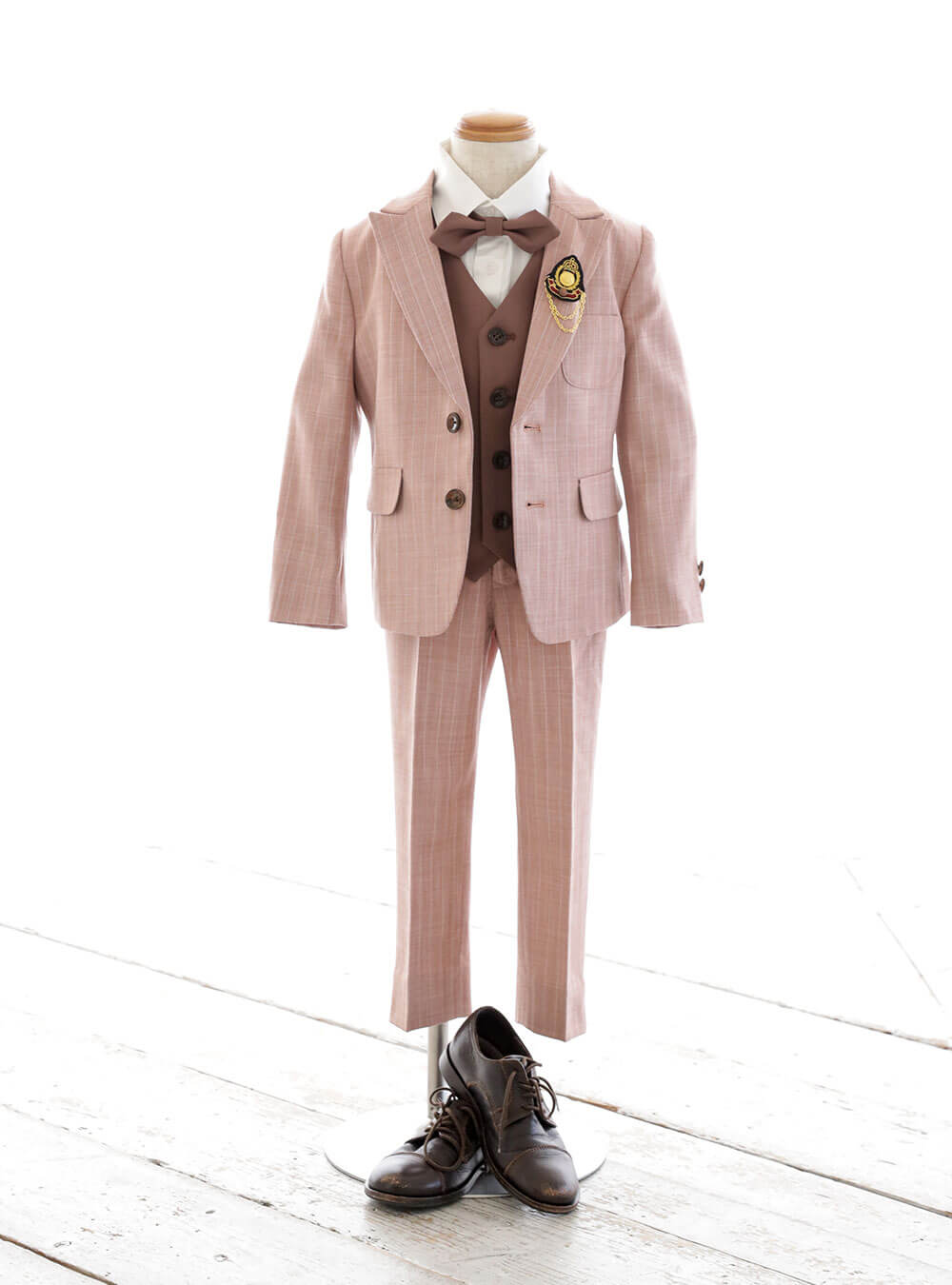 ピンクスーツとブラウンベストの組み合わせが絶妙なコントラストを生み出す、スタイリッシュでエレガントな一着です。ピンクのスーツは柔らかな色合いでありながらも、華やかで存在感があります。 ブラウンのベストは、ピンクスーツに落ち着いたトーンを加え全体のバランスを保ちながらも深みと上品さをプラスしています。お子様の可愛らしさと無邪気さを引き立てます。
