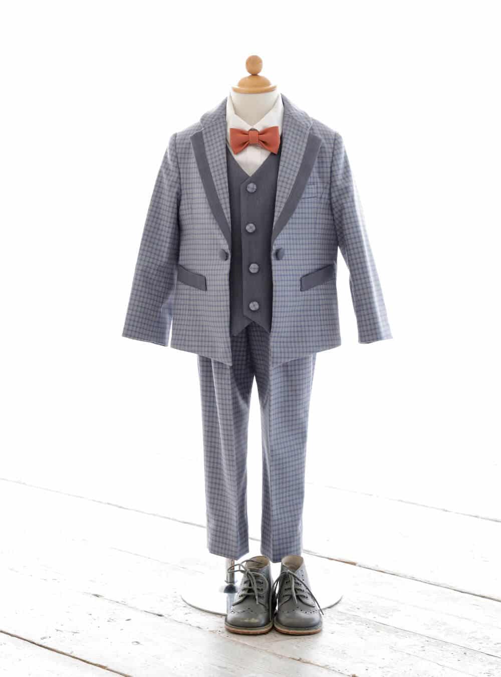 スタイリッシュでモダンなデザインが特徴のチェック柄スーツです。グレーベースのスーツは、シンプルでありながらも洗練された印象を与えます。ジャケットとベストのセットアップは細部にまでこだわった仕立てでお子様の体型にフィットしやすいデザインとなっています。 アクセントとなるオレンジの蝶ネクタイが、スーツ全体に遊び心を加え明るい印象を与えます。