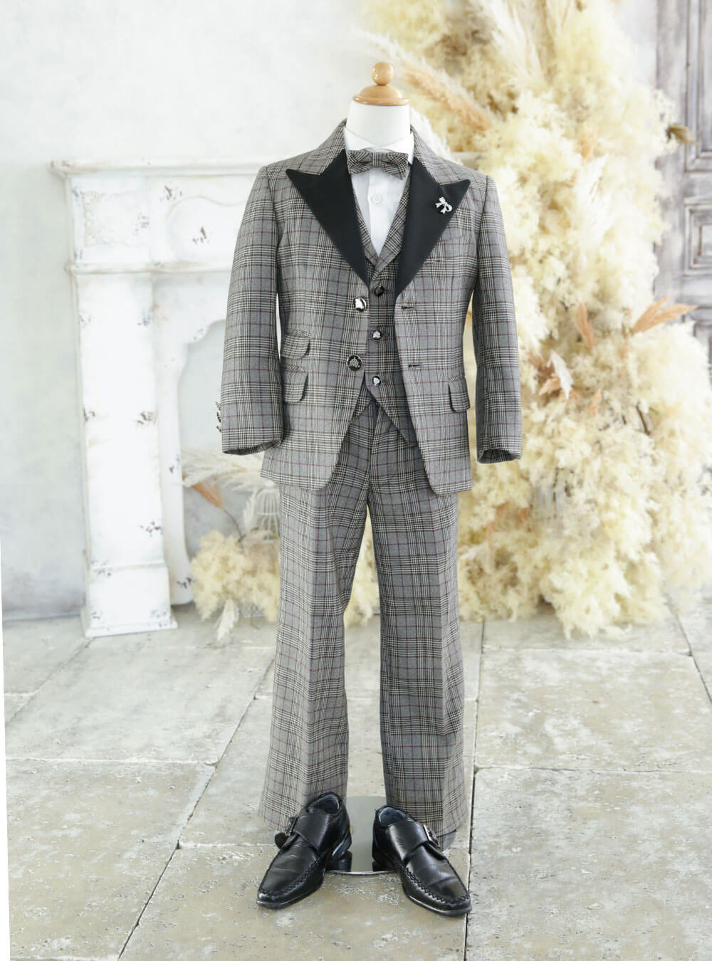 グレーチェックのタキシードは伝統と現代の要素が調和した洗練されたデザインです。クラシックなチェック柄が落ち着いた印象を与え、襟元にはエレガントなリボンのブローチが添えられており、少し遊び心が感じられるコーディネートになっています。 ベストと蝶ネクタイも同じ柄のデザインになるので、統一感があり大人っぽさも感じられます。