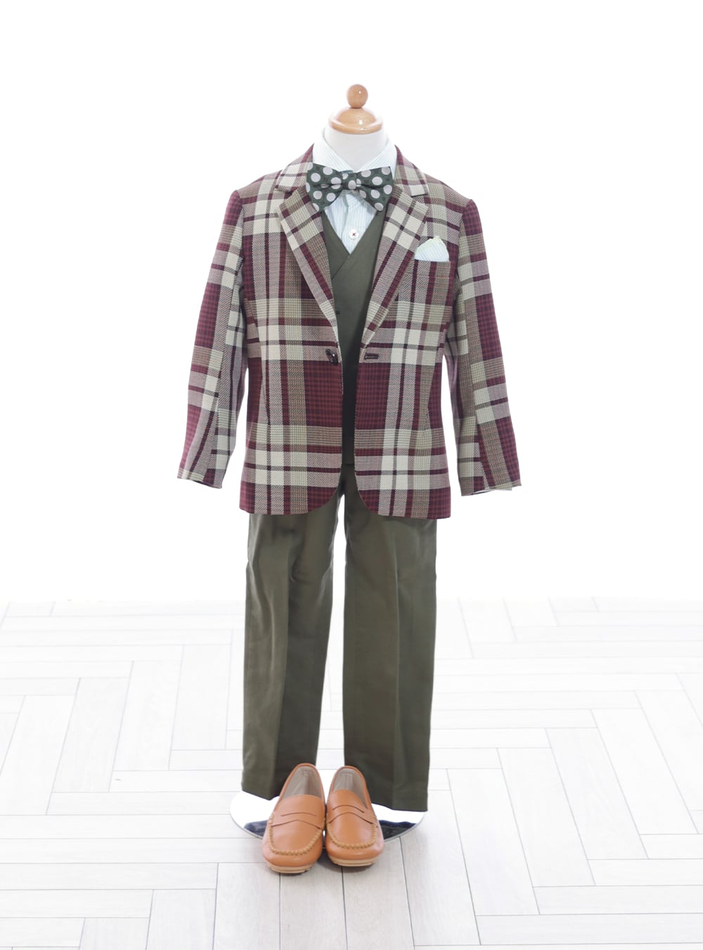 クラシックなチェック柄のフォーマルな衣装は大胆な赤とベージュのチェック柄で構成されておりヴィンテージ感あふれるデザインが特徴です。 ジャケットの下には同じチェック柄のベストが重ねられており統一感がありつつもモダンな印象を与えます。 ベストはリバーシブルになっているので裏側の無地の方で着るとよりシックな雰囲気になります。