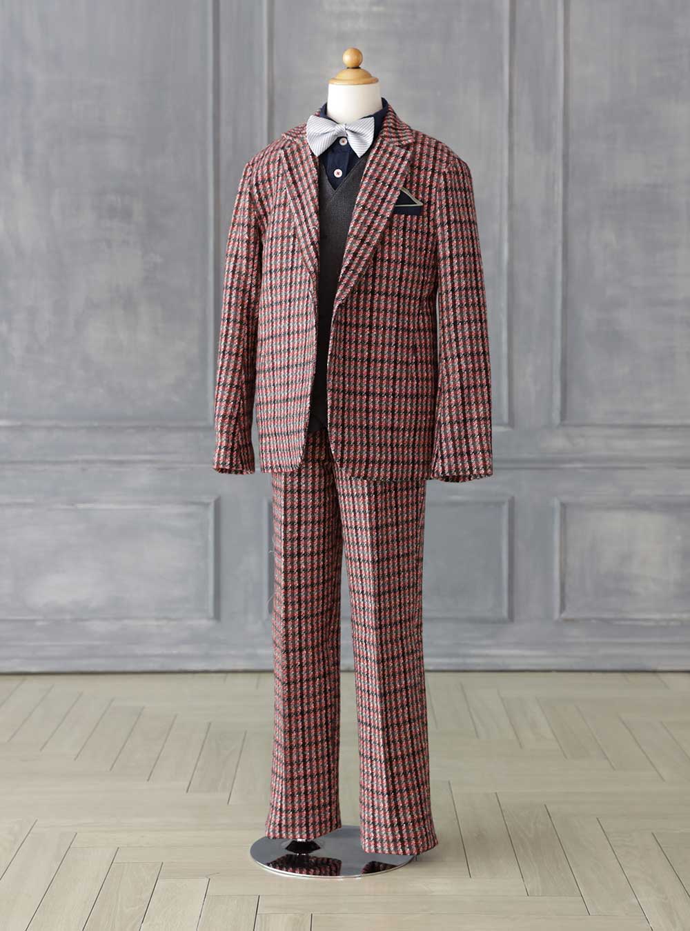 個性的なデザインとクラシックな印象を融合させたスタイリッシュなタキシードです。温かみのあるブラウン系のチェック柄が施されたジャケットはカジュアルさとフォーマルさを兼ね備えています。シンプルでありながら洗練されたシャツを合わせることで全体の印象が引き締まります。 パンツも同じチェック柄でコーディネートされており、統一感がありつつも遊び心を感じさせるスタイルに仕上がっています。