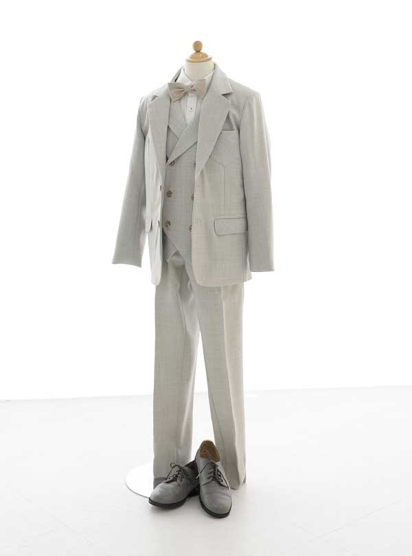 シンプルなグレーのタキシードです。シンプルな白シャツにベージュの蝶ネクタイが可愛らしくダブルボタンのベストにジャケットがとても大人っぽい印象です。 すらっとしたストレートパンツがスタイリッシュで大人顔負けの雰囲気で撮影していただけます。3歳サイズに同じ衣装があるので兄妹撮影にもぴったりです。