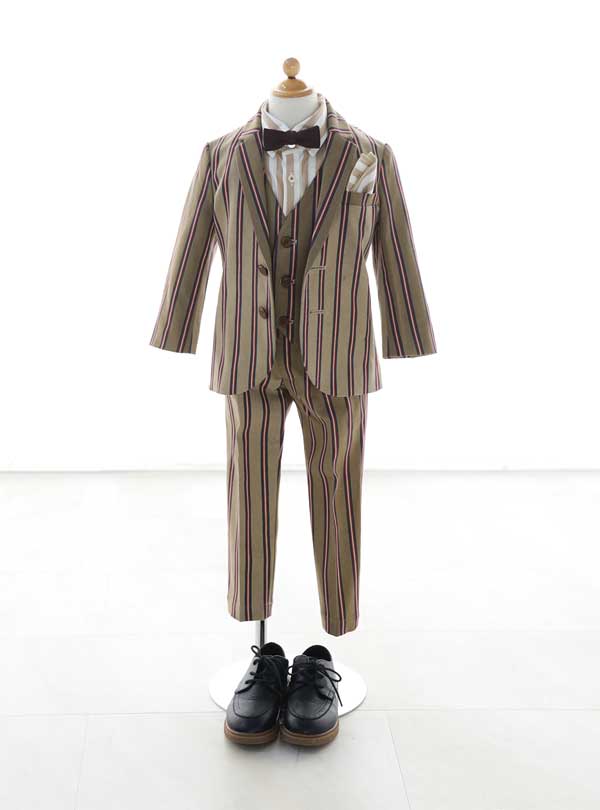 色味やデザインに大人っぽい雰囲気が漂う、ストライプ柄が特徴のタキシード。中のシャツとポケットチーフもストラ 赤のストライプラインがアクセントになりスタイルアップ。シャツにもデザインがあり、ジャケットを脱いでベストでの撮影もできる衣装です。